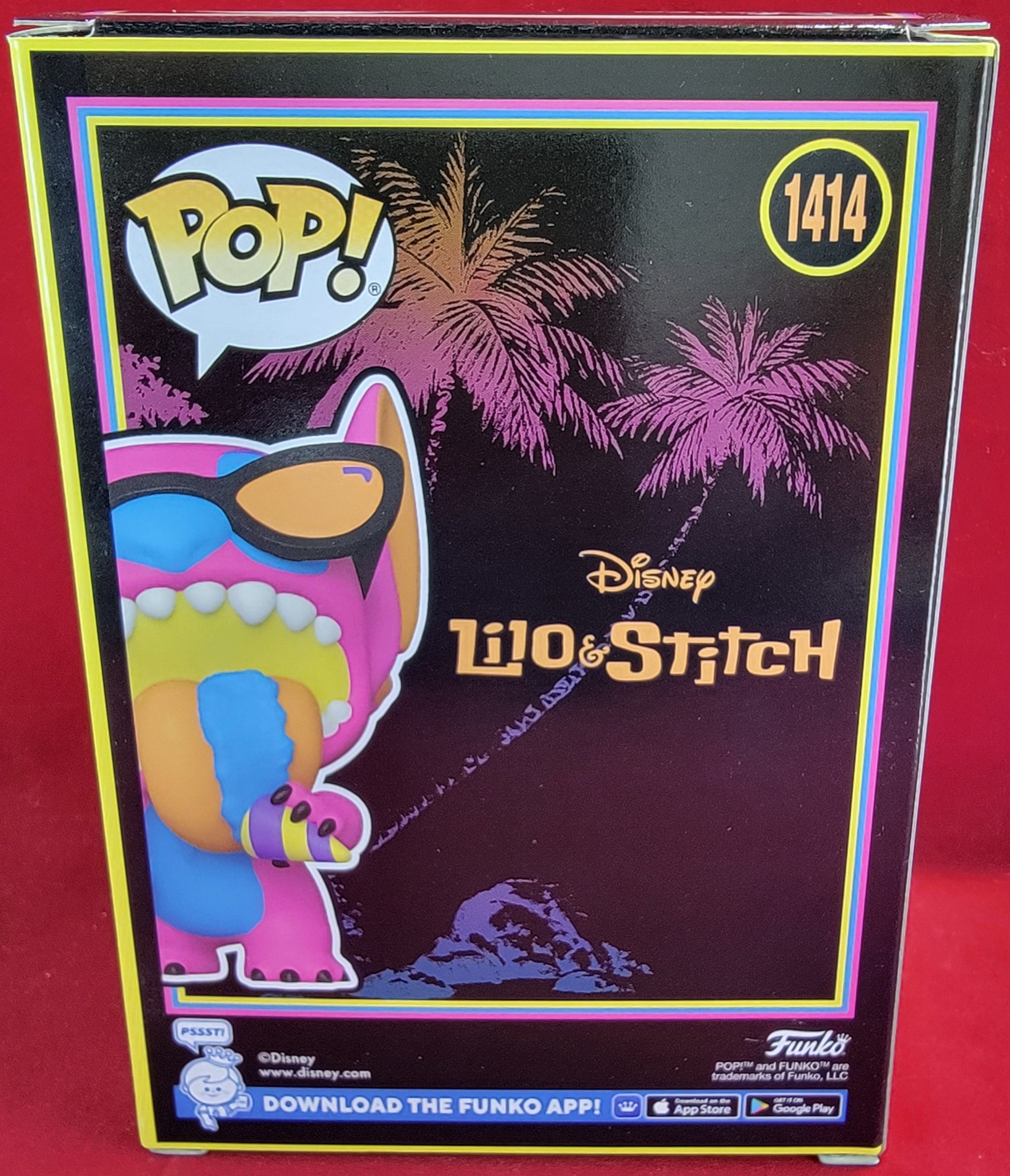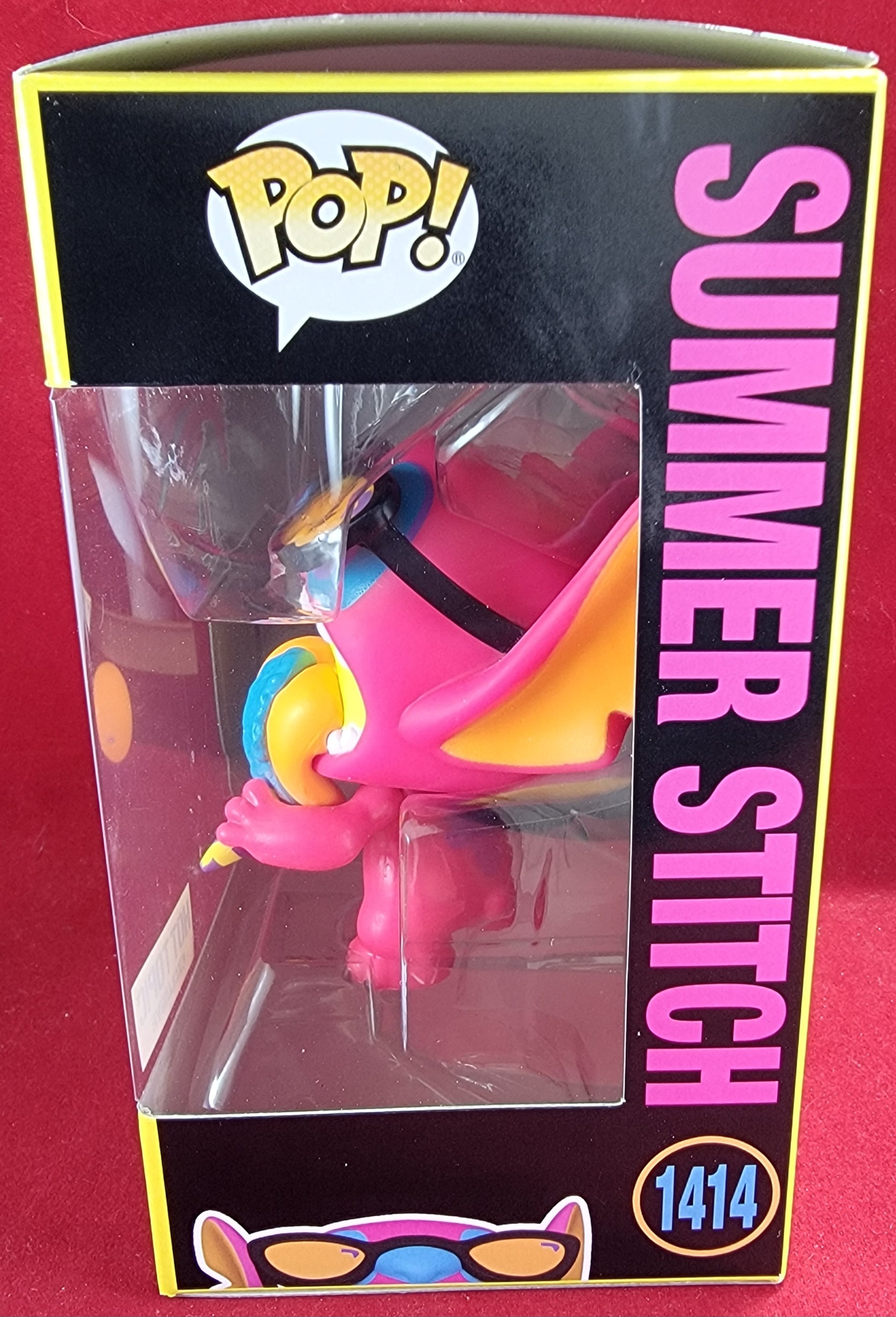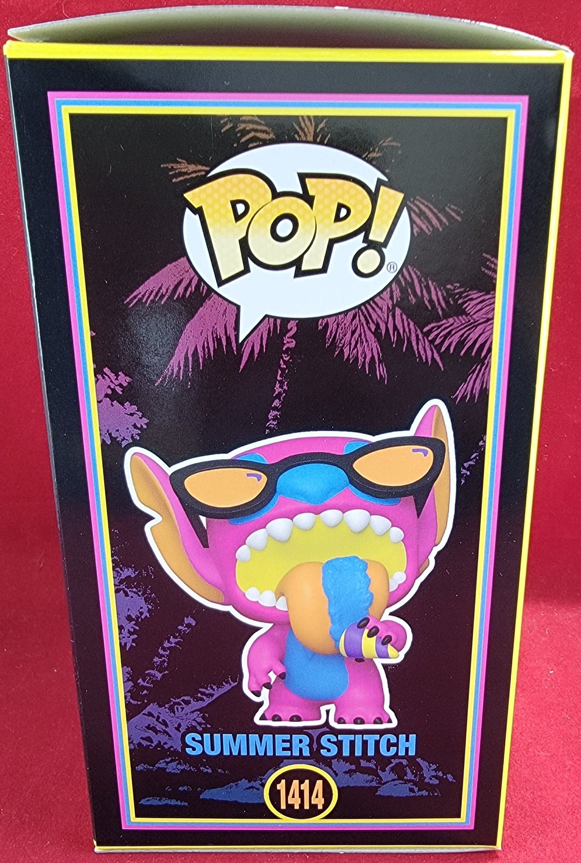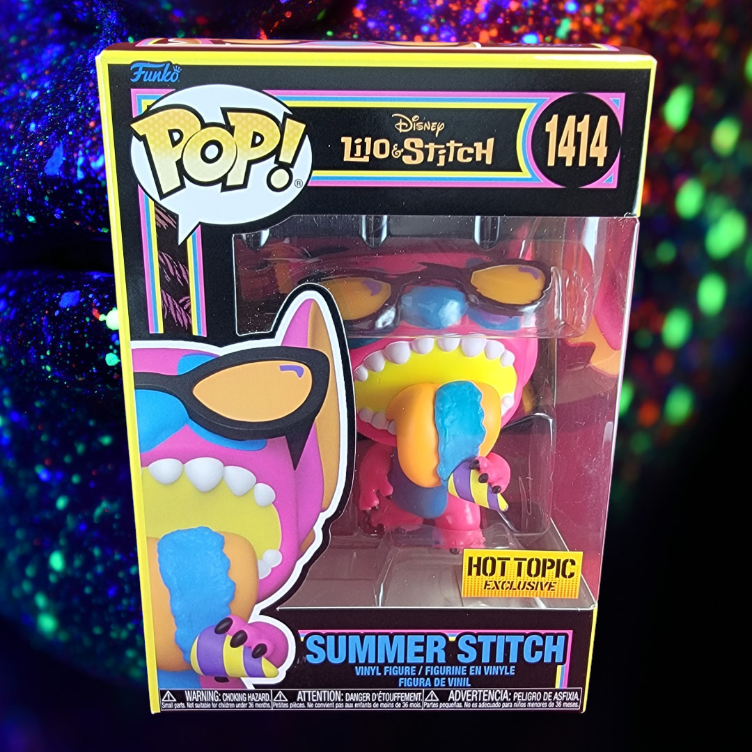 brand new 2024 disney blacklight Lilo & Stitch summer stitch pop. pop has stitch enjoying a sno cone in blacklight form. pop is in near perfect condition and will be shipped in a compatible pop protector.